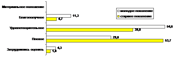 Судя по данным на рис. 1, свое материальное положение со знаком “плюс” оценили 66,0% молодежи и лишь 44,5% представителей старшего поколения.