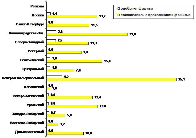 Доля жителей различных регионов, которым приходилось сталкиваться с проявлениями фашизма среди российской молодежи, а также одобряющих это явление, в %