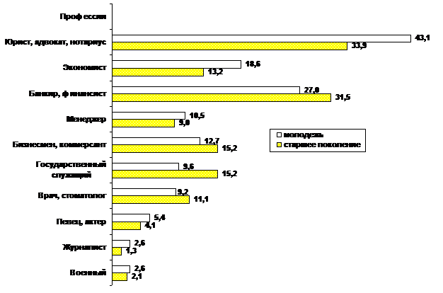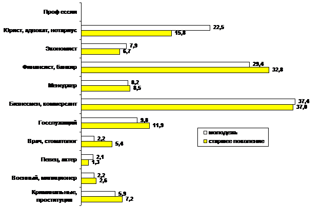 Какие профессии считают в настоящее время наиболее престижными молодое и старшее поколения, в %