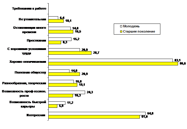 О том, что такой вывод носит достаточно обоснованный характер, говорит и анализ результатов выбора одного из двух основных требований к работе при ответе на альтернативный вопрос — либо интересная работа, либо высокий заработок. Среди молодежи интересную работу высокому заработку предпочли 59,0%, а среди старшего поколения — 53,0%. Как видим, и здесь показатели очень близки, но все же материальные факторы для молодежи чуть менее значимы, чем для представителей старшего поколения.