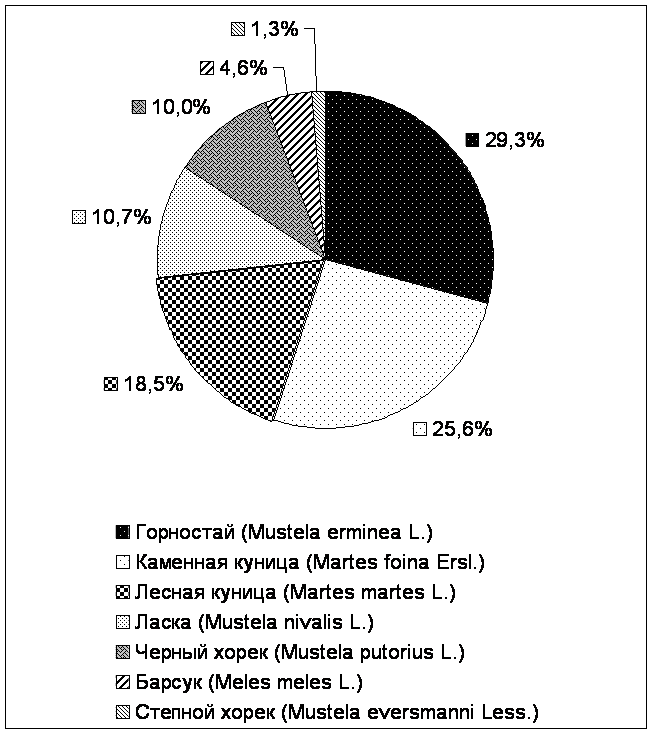 В Воронежской области обитает 11 видов куньих, из которых перевязка встречается, главным образом, в южных районах в очень редких случаях. [17] В период с 1999 по 2001 год было зарегистрировано 7 видов куньих (табл. 2). Доля каждого из видов, отмеченных наблюдателями, отражена на круговой диаграмме (рис.1).