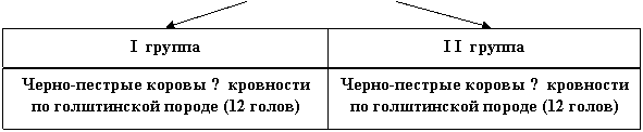 Для проведения опыта были подобраны 2 группы коров по 12 голов в каждой. В основу комплектования групп была положена различная доля кровности голштинской и черно-пестрой пород. Опыт проводили по следующей схеме.