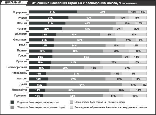 В то же время наши соотечественники осознают факт значительного экономического отставания, сдерживающего украинскую евроинтеграцию: наибольшая часть граждан (39,8%) считают реальным выход нашего государства на экономический уровень ведущих стран ЕС лишь через 20 лет. Однако, несмотря на это, большинство из них (66%) убеждены в необходимости вступления Украины в ЕС в течение ближайших 5—10 лет. Видимо, отношение граждан будет определяться не геополитическими преимуществами непосредственного соседства с ЕС, а конкретными результатами сотрудничества с расширенным Евросоюзом и тем, удастся ли минимизировать возможные негативные последствия его расширения для Украины.