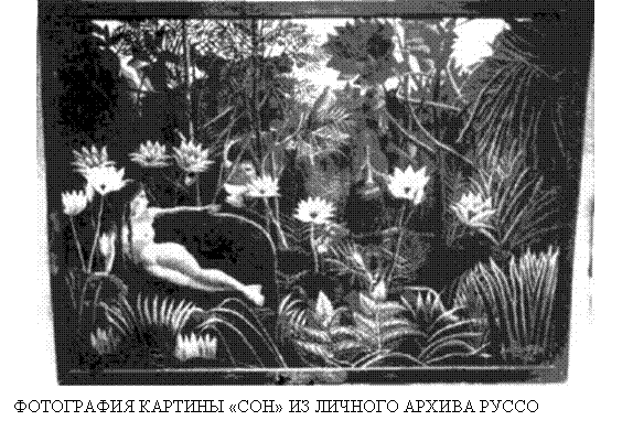 Так Руссо вступил в последний период своей жизни, апогеем которого стала картина Сон. Из прошлого он сохранил потребность следовать оригиналу и иногда для прорисовки контуров фигур зверей все же использовал пантограф. С все большей свободой он развивал тему растений, заполнявших переплетением форм громадные полотна. Зрителям они казались пришедшими из тропических лесов. Так возникло предположение о поездке Руссо в Мексику и рассказы о его частых посещениях парижского ботанического сада. Некоторые исследователи пытались найти прообразы этих растений в природе, в то время как на самом деле они явились плодом воображения Таможенника, выражением его богатой фантазии. Причудливость и густота растений облегчали Руссо решение проблемы построения пространства. Последнее оставалось для него камнем преткновения — он так и не смог научиться следовать законам перспективы. Определить границы плоскости, передать трехмерное пространство, придать композиции глубину, - все это для него было непостижимым. Теперь же, в результате сложного переплетения растений и их чередования на полотне возникала иллюзия пространства, которой способствовало колористическое решение. Меняющиеся оттенки причудливых растений создавали ощущение зрительной удаленности. Пышность и красочность растительности всегда зависят от цвета. Сами по себе растения не представляют у Руссо определенные образы, которые можно было бы найти в хорошо изученной европейской флоре. Следовательно, все они изменены и их невозможно узнать: они вырваны из реального пространства и своего естественного состояния и формы, однако все они выписаны так тщательно, что выглядят правдоподобными. Эта работа явилась еще одной формой проявления фантазии художника. Выразил это Руссо за несколько месяцев до своей смерти, когда он создал Сон .