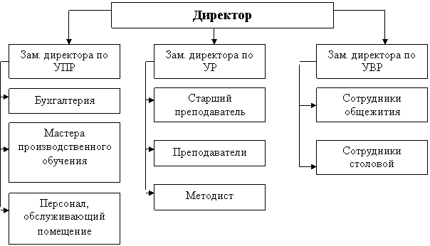Как видно из рисунка, руководство училищем осуществляет Директор, в линейном подчинении к нему относятся 3 заместителя по учебной, учебно-производственной и учебно-воспитательной работе, каждый из которых руководит, отведенному ему функциональным блоком служащих училища.