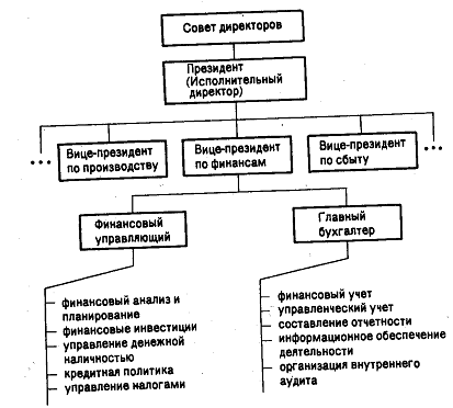 Организационная структура системы управления финансами хозяйствующего субъекта, а также ее кадровый состав могут быть построены различными способами в зависимости от размеров предприятия и вида его деятельности Для крупной компании наиболее характерно обособление специальной службы, руководимой вице-президентом по финансам (финансовым директором) и, как правило, включающей бухгалтерию и финансовый отдел (рис. 1.3).