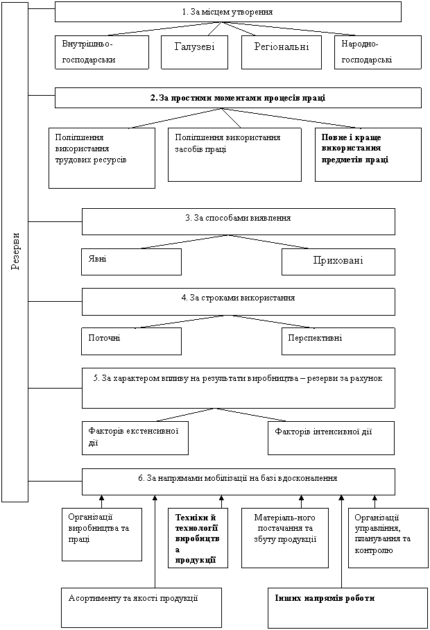 Второе понимание резерва связывают, прежде всего, с разными потерями ресурсов (порча, пропажа, брак, уценка), уплатой штрафов, пени, неустоек и другими убытками. Это явные, бесспорные резервы. Тем не менее есть такие, что обуславливаются повышением норм расходования ресурсов, перерасходами заработной платы, несвоевременным выполнением мероприятий из внедрения новой техники и технологий, недозагрузкой свободных производственных мощностей и т.п Одни резервы – это безвозвратные потери ресурсов или прибылей, другие могут быть использованы в следующие периоды времени (рисунок 1). Действующие классификации резервов имеют много общего с классификациями факторов.