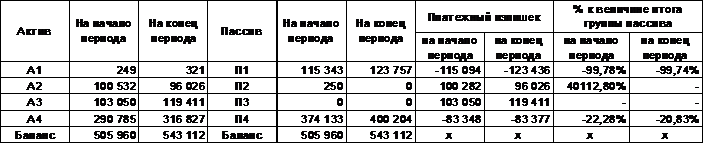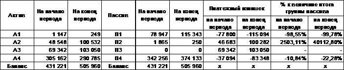 Для определения ликвидности баланса надо сопоставить произведенные расчеты групп активов и групп обязательств. Баланс считается ликвидным при следующем соотношении групп активов и пассивов: