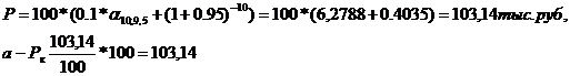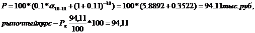 Предположим далее, что ставка банковского процента снизилась с 11 % до 9,5 %. Номинальная стоимость облигации и размер ежегодных выплат при этом сохраняется неизменным. Тогда рыночная цена облигации составит: