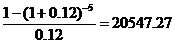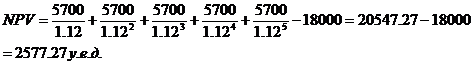 Пример 3.3.Фирма рассматривает целесообразность приобретения новой технологической линии по цене 18000 у.д.е. По прогнозам сразу же после пуска линии ежегодные поступления после вычета налогов составят 5700 у.д.е. Работа линии рассчитана на пять лет. Ликвидационная стоимость линии равна затратам на ее демонтаж. Необходимая норма прибыли составляет 12 %. Следовательно, чистая текущая стоимость проекта равна по (3.I):
