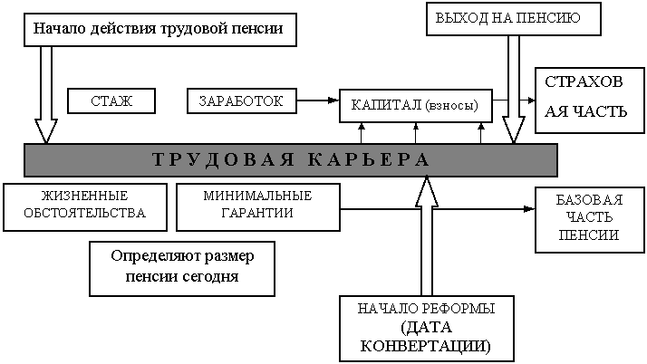 Страховая часть новой трудовой пенсии определяется из суммы уплаченныхпосле 01. 01. 2002 г. страховых взносов. Кроме того, к этому сформированному капиталу добавляется сумма «стартового» капитала, исчисленного из заработка и стажа до 01. 01. 2002 г., которые в дальнейшем перестают играть какую-либо роль в определении размера пенсии.[5]
