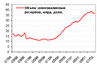 - объем золотовалютных резервов вырос после кризиса 1998 г. в три раза (текущее значение составляет 36.7 млрд. долл. против 12.0 млрд. долл. на начало 2000 г.);