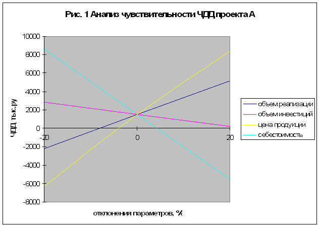 Как видно на рис. 1, наиболее чувствителен проект А к отклонению себестоимости, особенно в сторону повышения. Это делает зависимым проект от влияния изменения цен поставщиков, что соответственно должно быть учтено в плане заключения договоров на поставки сырья, энергии.