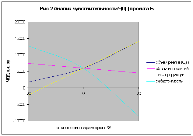 Наиболее значительными факторами в реализации проекта Б, как видно на рис. 2, являются также себестоимость продукции и ее цена реализации. Но проект Б менее чувствителен по сравнению с проектом А к колебаниям рассмотренных факторов.