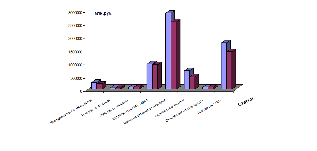 Также допущена экономия по следующим статьям: вспомогательные материалы, топливо со стороны, энергия со стороны, затраты на оплату труда, затраты на капитальный ремонт и затраты на социальные нужды и прочие производственные расчеты. По прочим расходам также допущена экономия в размере 334047 млн. руб. Снижение себестоимости по этой статье составило 18,9%, за счет чего себестоимость товарной продукции понизилась на 5%. Наименьшая экономия допущена по статье “затраты на оплату труда”. Произошло снижение расходов в размере 21409 млн. руб., из-за чего себестоимость всей товарной продукции снизилась на 0,3%.