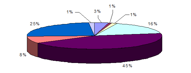 В состав затрат на производство товарной продукции основная часть расходов приходится на амортизационные отчисления –44,07% (рост амортизационных отчислений дан в табл. 1 ) и составляет в отчетном году 25553977 млн. руб. Вторая значительная составляющая затрат на производство - отчисления на воспроизводство минерально-сырьевой базы, платежи собственнику недр, за пользование землей, налоги, экологические платежи- все названные платежи и отчисления занимают 24,65% всех расходов и составляют 1429254 млн.руб. Все остальные статьи затрат занимают от 3 до 16%: так, расходы на оплату труда составили 938054,5 млн. руб. или 16,2%, затраты на проведение капитального ремонта – 8%, на материальные затраты (вспомогательные материалы, топливо и энергия) составили 5,6% или 323047 млн. руб.