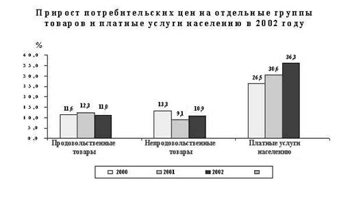 В декабре 2002 года индекс потребительских цен (ИПЦ) составил 101,5 % (за аналогичный период 2001 года — 101,6 %). Можно отметить также, что в 2002 году по сравнению с предыдущим годом сблизились темпы прироста цен на продовольственные (111,0 % против 117,1 % в 2001 году) и непродовольственные товары (110,9 % против 112,7 %). Темпы роста цен на платные услуги населению остались на уровне 2001 года — 136,2 % против 136,9 %.
