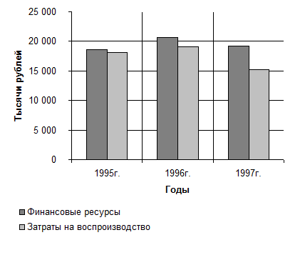 Достаточность финансовых ресурсов для обеспечения воспроизводственного процесса, наличие свободных денежных средств для расширения производства продукции - решающие факторы в оценке эффективности управления финансовыми ресурсами. Финансовые ресурсы предприятия как минимум должны покрывать суммы его затрат на производство продукции. В 1995 году затраты на производство продукции составляли 18126 тыс.р., а сумма финансовых ресурсов предприятия составляла 18601 тыс.р. Следовательно процентное соотношение затрат на воспроизводство и финансовых ресурсов в 1995 году составляло 97%. В 1996 году затраты на воспроизводство увеличились до 19083 тыс.р. в то время как финансовые ресурсы предприятия увеличились до 20688 тыс.р. Соотношение затрат на воспроизводство и финансовых ресурсов составило 92%. В 1997 году затраты на воспроизводство значительно уменьшились, их сумма составила 15198 тыс.р. Финансовые ресурсы предприятия в это же время уменьшились не значительно и составили в 1997 году 19158 тыс.р. Соотношение затрат на воспроизводство и финансовых ресурсов составило 79%.