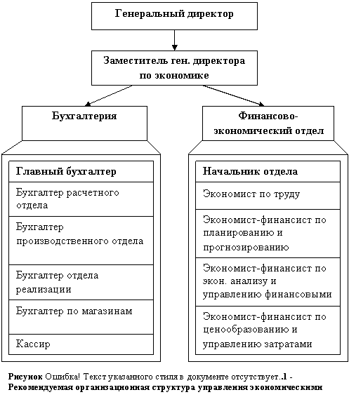Фактическая численность учетно-финансового отдела - шестнадцать человек, из них 11 человек занимаются бухгалтерской работой, четыре экономиста, и инженер по организации труда. Следовательно необходимо выделить в составе организационной структуры предприятия бухгалтерию и финансово-экономический отдел. Так же необходимо разделить полномочия между этими экономическими службами. Рекомендуемая структура управления экономическими службами представлена на рисунке 4.1.