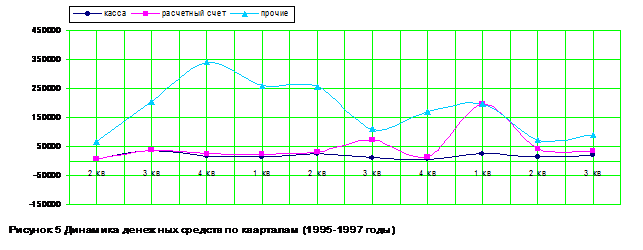 Общее движение денежных средств представлено в Приложении 3. Представим на графике изменение денежных средств по наиболее важным для анализа статьям за период 1995-1998гг. (рис. 5).