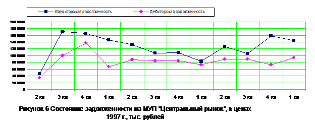 Большое внимание следует уделить динамике изменения кредиторской и дебиторской задолженности. Тенденции изменения кредиторской и дебиторской задолженности в 1995-1998гг. на МУП "Центральный рынок" приведены на графике (рис.6).
