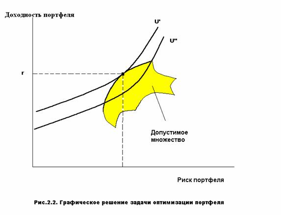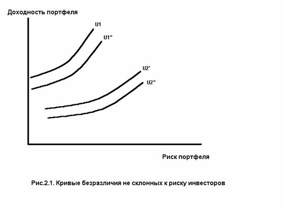 На рис.2.1 представлены по две кривые безразличия двух инвесторов, по степени выпуклости кривых можно сказать, что первый из них более склонен к избежанию риска, чем второй. Кривая, лежащая выше и левей, соответствует большей величине полезности множества равнозначных портфелей, представленных этой кривой.