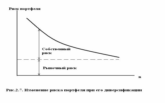 Первое слагаемое в (2.20) характеризует рыночный (систематический, недиверсифицируемый) риск , а второе - собственный риск портфеля, который может быть уменьшен за счет диверсификации как показано на рис.2.7.