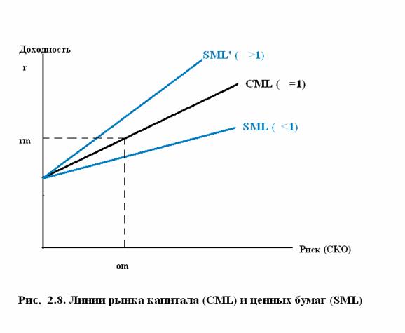 - ниже линии CML (рис.2.8). В любом случае активы с большим риском должны обеспечивать пропорционально большую доходность. Таким образом, если портфель эффективен, связь между ожидаемой доходностью каждой акции и ее предельным вкладом в портфельный риск должна быть прямолинейной. Верно и обратное: если прямолинейной связи нет, портфель не является эффективным.