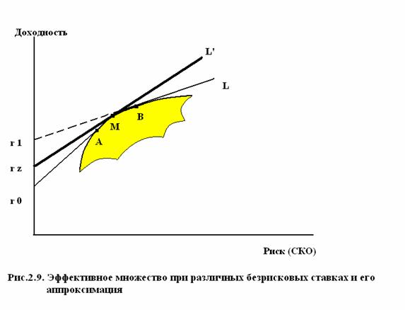 Возможность получать кредит по безрисковой ставке на практике имеет только государство, для других инвесторов эта ставка выше, поэтому эффективный фронт изменяется и приобретае вид кривой