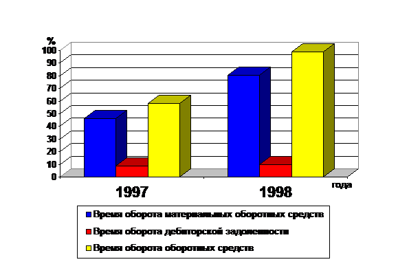 Из данных таблицы 3.4 видно, что произошло снижение оборачиваемости всех приведённых показателей. Оборачиваемость дебиторской задолженности уменьшилась по сравнению с 1997 годом с 42,9 оборотов в год до 36,3 оборотов, то есть по сравнению с предыдущим годом погашение дебиторской задолженности происходило более медленными темпами. Время оборота дебиторской задолженности составляет 8,5 дней в 1997 и 10 дней в 1998 году. Это говорит о том что дебиторская задолженность погашается достаточно быстро. Изменение времени оборота по годам представлено на рис. 2.