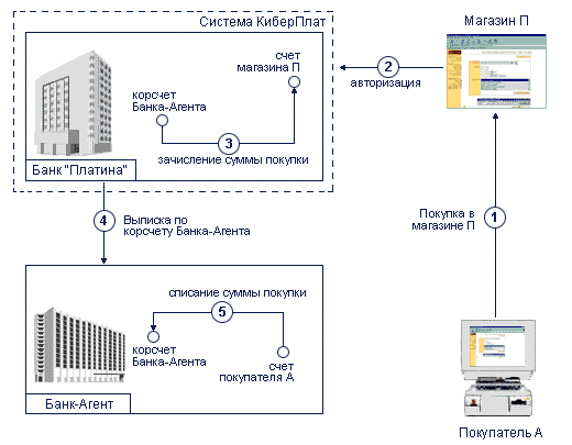 При покупке покупателем - клиентом КБ "Платина" в магазине - клиенте Банка-Агента (1) в результате авторизации (2) сумма покупки списывается со счета покупателя - клиента КБ "Платина" и зачисляется на корреспондентский счет Банка-Агента в КБ "Платина" (3) за вычетом комиссионного вознаграждения. Банк-Агент по полученной выписке (4) зачисляет указанную сумму на счет своего клиента - магазина (5).