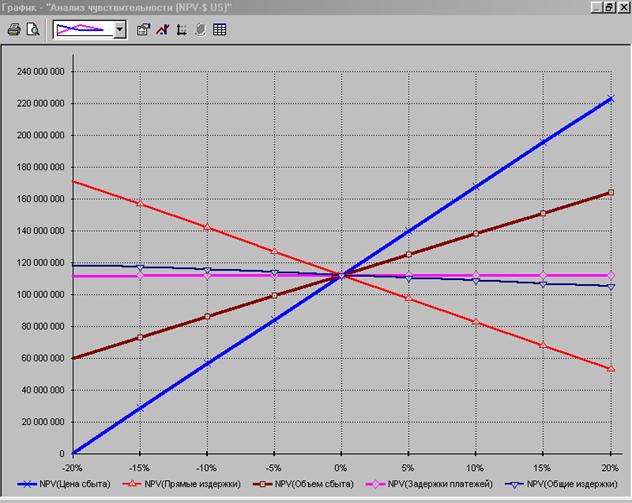 Ниже приводится график, демонстрирующий чувствительность проекта в отношении каждого из названных выше параметров.