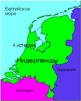 За этой страной укрепилось два названия: Простонародное - Голландия, что в переводе на русский означает “страна у беспокойного, бурного - моря” или “полая земля”. Действительно, Более или менее прочные слои грунта залегают здесь на глубине 10 - 12 метров, поэтому в старину в Голландии многие здания и даже города строили на сваях.