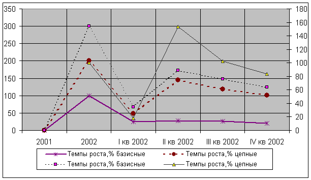В 2002 году базисные темпы роста реализации продукции совпадают с темпами роста цепными производства, это говорит о том, что реализуется продукции столько, сколько производится. В 2002 году базисные темпы роста реализации продукции совпадают с темпами роста цепными производства, это говорит о том, что реализуется продукции столько, сколько производится.