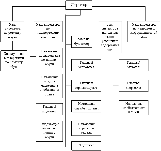 Помимо этого функционирует два магазина по продаже обуви. Обеспечивают работу предприятия отделы: маркетинга, бухгалтерия, планово – экономический отдел, торговый отдел, отдел главного механика, отдел моделирования технологии и качества и другие службы.