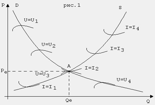 В силу свойств кривых спроса и предложения равновесное решение является устойчивым в том смысле, что если цена строго фиксирована и равна равновесной P=Pe , то товаропроизводитель, максимизируя прибыль, поставляет на рынок товар в количестве S(pe)=Qe; одновременно потребитель, стремясь максимизировать полезность, предъявляет спрос D(pe)=Qe. При установлении на рынке совершенной конкуренции равновесной цены объем товаров , предлагаемый товаропроизводителем и доставляющий ему максимум прибыли по данной цене, в точности равен спросу потребителя.