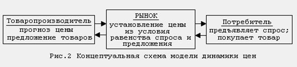 Концептуальная модель любого процесса динамики цен включает взаимодействие трех подсистем, которые можно условно назвать “товаропроизводитель”, “потребитель” и “рынок” (рис.2). Паутинообразная модель (модель А), в которой спрос отстает от предложения на один период: D(Pt+1)=S(Pt), также вписывается в схему рис.2.