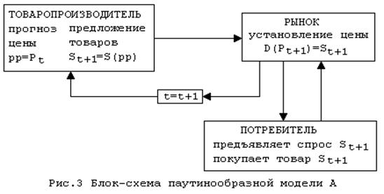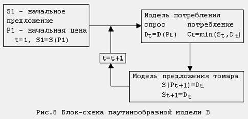 Модель можно представить в виде блок-схемы, изображенной на рис.8. Из этой блок-схемы видно, что в рассматриваемой модели происходит отставание предложения: S(Pt+1)=D(Pt).