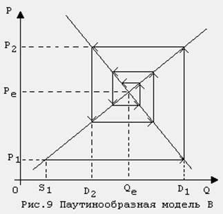 Если же s<d, то в этом случае колебания цен увеличиваются, а при s=d, как и в модели А, происходит колебание цен с постоянной амплитудой. Как видим, изменение гипотез модели А привело не только к смене направления “наматывая” спирали, но, следовательно, и к изменению условия сходимости итерационного процесса на противоположное.
