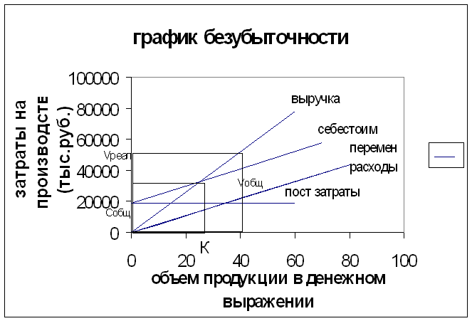 Исходя из этих данных я построила график безубыточности, где К – это критическая точка, которая примерно равна 23 тыс. И если производить и реализовывать продукции меньше, чем критический объем, то предприятие будет иметь убытки- на графике прямая себестоимость выше прямой выручки и наоборот. Если же производить и реализовывать больше критического объема, то у предприятия будет прибыль.