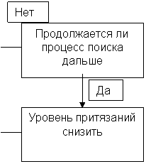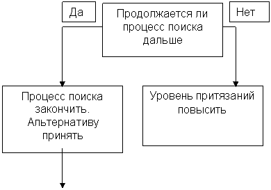 Часто принимающий решение не имеет полного обзора всех возможных для реализации альтернатив, так как он имеет набор альтернатив, ограниченных и определенных временем. При этом он неосознанно следует "теории приспособления притязаний". Поиск оканчивается, если открыта альтернатива, предполагаемый целевой вклад которой удовлетворяет уровню притязаний поиска. Конечно, если, несмотря на интенсивный поиск, не находят удовлетворительной альтернативы решения, тогда снижают свой уровень притязаний, поиск прекращают и реализуют лучшую из найденных. Если же, напротив, неожиданно быстро возникает альтернатива принятия решения, то поднимают свой уровень притязаний и продолжают искать дальше (рис.7).