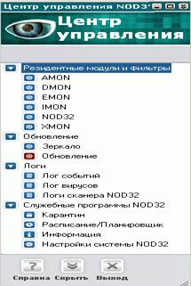 Главное окно Центра управления NOD32 содержит список установленных системных модулей и их возможностей (исключение составляет сканер по требованию, значок которого доступен на рабочем столе и который также может быть запущен как запланированная задача). В главном окне доступны следующие группы: Резидентные модули и фильтры, Обновление, Логи и Служебные программы NOD32. Детальные описания каждой группы представлены ниже. Для перемещения в пределах главного окна Центра управления используется мышь или клавиши стрелок вверх/вниз.
