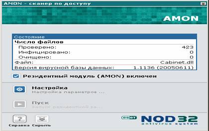 AMON (Антивирусный МОНИТОР) - резидентная (выполняющаяся в оперативной памяти после каждого перезапуска компьютера) программа проверки файлов. Автоматический запуск AMON при перезапуске компьютера - фундаментальная защита против злонамеренного кода. Не рекомендуется отключать AMON, если только это не требуется специальными обстоятельствами. AMON - наиболее важная линия антивирусной защиты. Критически важно сохранять его всегда функционирующим с использованием самой современной версии вирусных баз данных. AMON контролирует все потенциально угрожающие действия на защищенных компьютерах типа открытия, выполнения, создания или переименования файлов. AMON часто упоминается как антивирусный монитор или сканер “на-доступе” в отличие от сканера “по требованию”. Для выполнения своих задач AMON требует важных системных прав. С технической точки зрения он работает на уровне системного драйвера. В результате, совместимость с другими службами, выполняющимися на компьютере, должна быть проверена в процессе инсталляции системы NOD32. Если тестирование было успешно завершено, AMON будет запускаться автоматически после каждой перезагрузки компьютера.