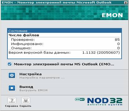 DMON может быть активирован выбором опции ниже окна состояния DMON. Окно показывает общее число проверенных, инфицированных и очищенных объектов. Оно также отображает текущую версию вирусной базы данных. Монитор документов включен - если галочка установлена, проверка документов включена. Настройка - отображает окно конфигурации сканера.