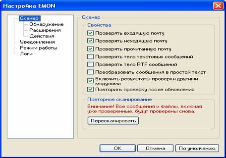 Пepecкaниpoвaть - сбрасывает результаты проверки и передает электронную почту на повторное сканирование при следующем обращении. (это происходит автоматически всякий раз, когда NOD32 обновляется до более новой версии)