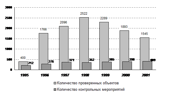 В 2001 году Счетной палатой проведено 409 контрольных мероприятий, в том числе 34 – по поручениям палат Федерального Собрания Российской Федерации, обращениям членов Совета Федерации и депутатов Государственной Думы и запросам органов государственной власти. Контрольными мероприятиями было охвачено 1545 предприятий и организаций, расположенных на территориях 55 субъектов Российской Федерации. В динамике ситуация выглядит следующим образом:
