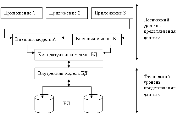 Различают концептуальный, внутренний и внешний уровни представления этих баз данных, которым соответствуют модели аналогичного назначения.