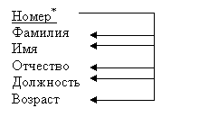 Такое определение функциональной зависимости позволяет при анализе всех взаимосвязей реквизитов предметной области выделить самостоятельные информационные объекты. В качестве примера рассмотрим графическое изображение функциональных зависимостей реквизитов работников, приведенное на рисунке 5, на котором ключевой реквизит указан звёздочкой.