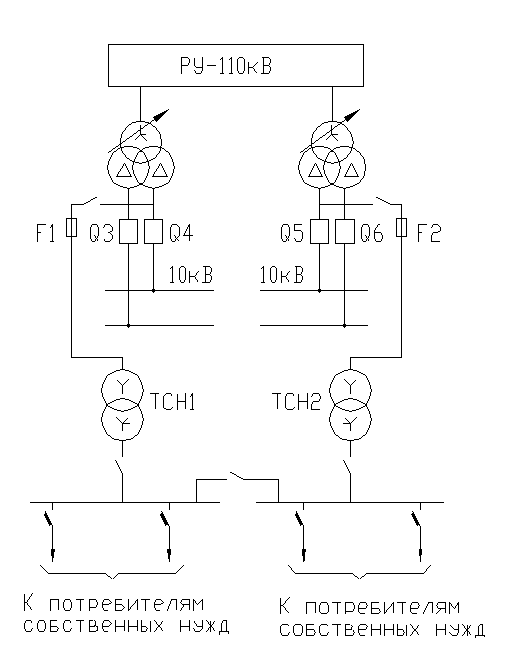Схема подключения ТСН выбирается из условия надёжного обеспечения питания ответственных потребителей. Выбираем схему питания СН с выпрямленным переменным оперативным током (рис.6.2). Трансформаторы СН присоединяются отпайкой к вводу главных трансформаторов. Такое включение обеспечивает возможность пуска ПС независимо от напряжения в сети 10кВ.