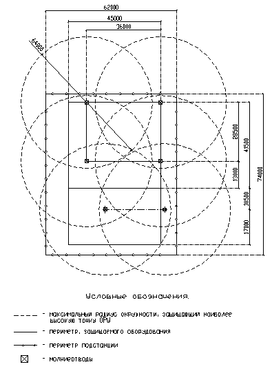 В данной работе расчет грозозащиты сводится к определению местоположения молниеотводов, которые определяются таким образом, чтобы зона действия молниеотводов полностью защищала все электрооборудование подстанции.